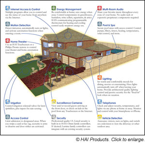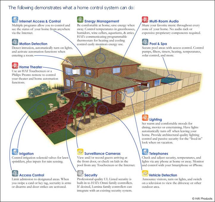 Home Control devices can work in a stand-alone mode so they are not dependent on any other products in the house, including computers. No single part can cause an entire system to fail. Your normal light switches still control the lights, and thermostats still control your heating and cooling system. How Home Control WorksHAI Home Control systems can take one or more actions when certain events occur, such as: